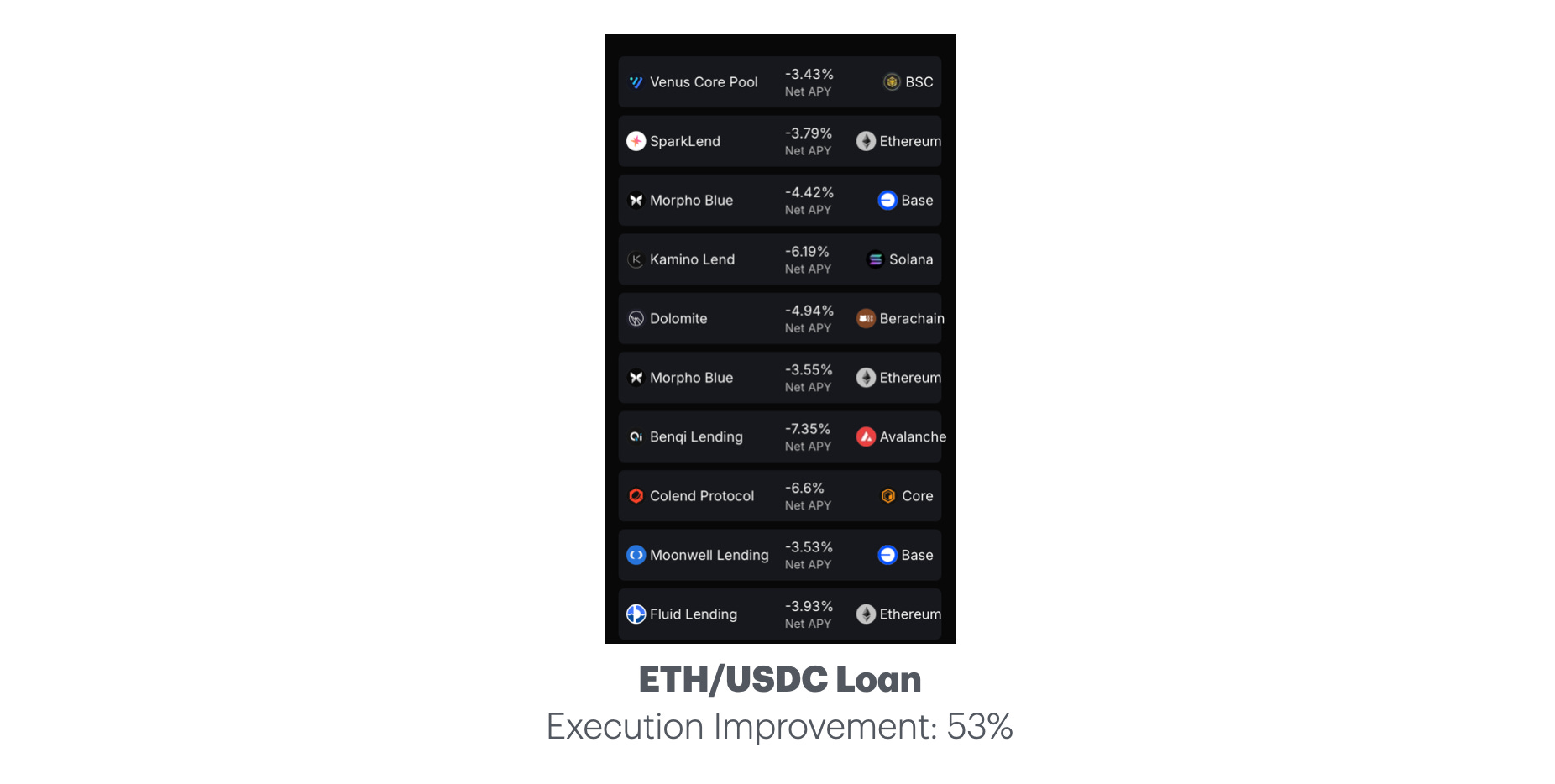 Existing yield aggregators like Beefy and Yearn use strategy vaults to capture yield through fixed execution paths to a small number of underlying protocols. More importantly, they are singularly focused on the yield bearing side of the equation. Morpho’s deprecated Aave optimizer offering might be considered a loan aggregator in the loosest sense since it overlaid its peer-to-peer marketplace with a dynamic interest rate that was bounded by Aave’s borrow/lend rate spread. A successfully matched ETH loan on its P2P marketplace would yield an execution improvement of 2.7% (0.07% APR less) for the borrower and ~36% for the lender (0.66% APR more). This improvement would be sustainable for both sides while the loan was still actively matched in Morpho’s P2P market. However, this execution improvement is solely within the confines of one venue (Aave) and not across multiple venues.