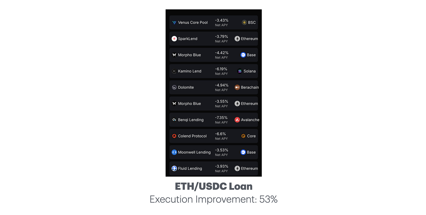 All existing yield bearing and borrow aggregation approaches do not allow for global execution venue access. At best, they optimize between two or maybe three protocols on the same chain. Rebalancing yield bearing strategies across multiple protocols is usually done only occasionally and due to limited execution paths, accessible upside is much more limited than what the global market expresses. The vast majority of all borrow and lend positions today are leaving money on the table and lots of it.